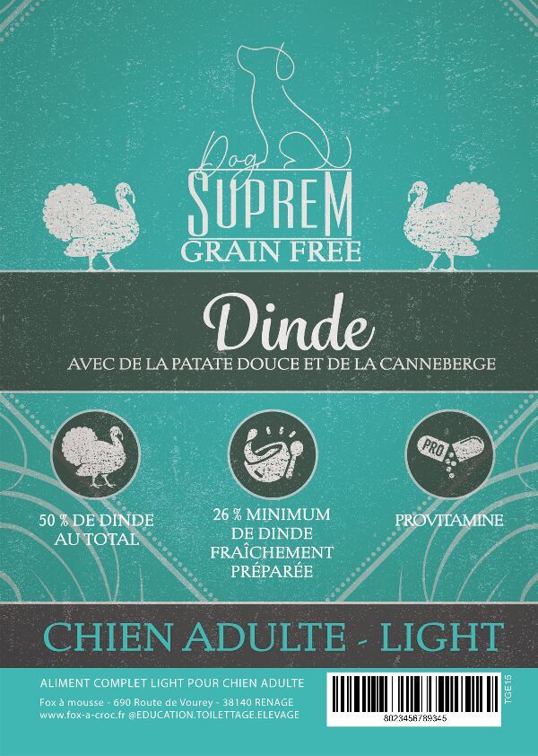 CompositionDinde 50 % (y compris de la dinde fraîchement préparée 27 %, de la dinde séchée 21 % et du bouillon de dinde 2 %), patate douce (16 %), pomme de terre, pois (8 %), pulpe de betterave, graines de lin, complément oméga-3, minéraux, canneberge (0,2 %), glucosamine (170 mg/kg), méthyl-sulfonyl-méthane (170 mg/kg), sulfate de chondroïtine (125 mg/kg), Fructooligosaccharides (FOS, 96 mg/kg), Mannanoligosaccharides (MOS, 24 mg/kg) |